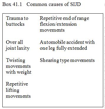 A number of problems arise in dealing with the accurate diagnosis of SIJ dysfunction SIJD). One problem occurs in that the pain patterns are similar to those of other common low back pain disorders. A diagnostic conundrum presents owing to the fact there are no concrete uniform criteria dealing with SIJD (van Duersen et al 1990). Practitioners have in the past dumped a number of indiscernible low back pain problems into the SIJD category. This practice has led, historically, to a lack of credibility being given to the diagnosis of SIJD. Another problem involved with the diagnosis of SIJD is the nature of the activity that causes the injury. Activities that can commonly cause SIJD (Box 41.1) are very similar to activities that are found to cause more commonly accepted low back pain disorders. Owing to these diagnostic and historical problems, a common practice of overlooking SIJD as a possible pain source has evolved in most mainstream orthopedic practices (Shaw 1993). In most circles, the diagnosis is completely overlooked or cast off as one of quackery.