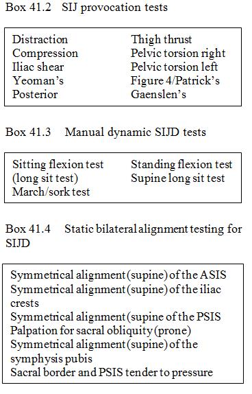 The diagnosis of SIJ dysfunction was determined by the anatomic location of patient pain, response to SIJ provocation testing and manual testing abnormalities seen during movements that are combined with bilateral symmetry abnormalities. If one or more of the tests in each category was positive, and a specific region of pain was present at the SIJ, the patient was diagnosed as having SIJD. The series of tests that are used to diagnose SIJD are seen in Boxes 41.2-41.4.