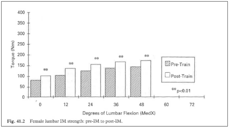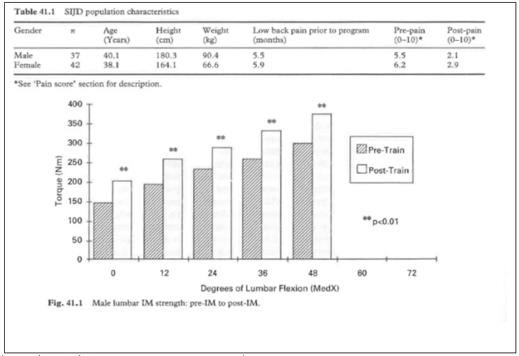 1. This study reveals very positive results in the areas of self-reported subjective decrease in low back pain, as well as objective increases in lumbar strength and increased functional status (work level).
